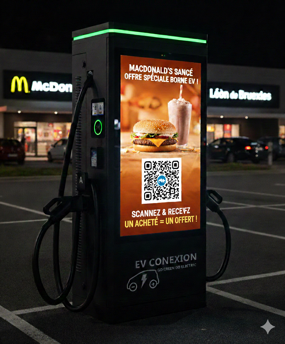 La force de ce support réside dans le temps d’attente. Un conducteur reste en moyenne entre 20 et 45 minutes à proximité de la borne. Impact : Un taux de mémorisation publicitaire bien supérieur aux panneaux d’affichage classiques. Ciblage : Vous attirez une clientèle à fort pouvoir d’achat (propriétaires de VE).